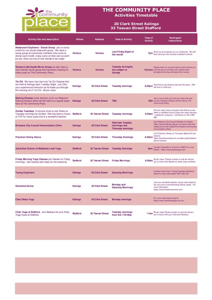 Please find information about our regular programs and activities here on our timetable. Also follow along our Facebook page for any new events or activities that might not appear on the timetable. Click on the timetables below and the image will be much clearer to read.